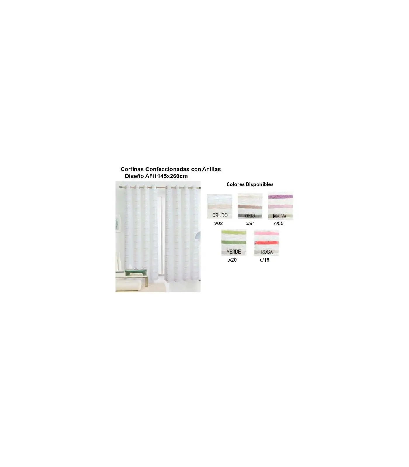 Cortina confeccionada con ollaos en un tejido de transparencia media fácilmente lavable y que no necesita plancha. Medida 150x260 cm. 100% microfibra. Modelo: AÑIL