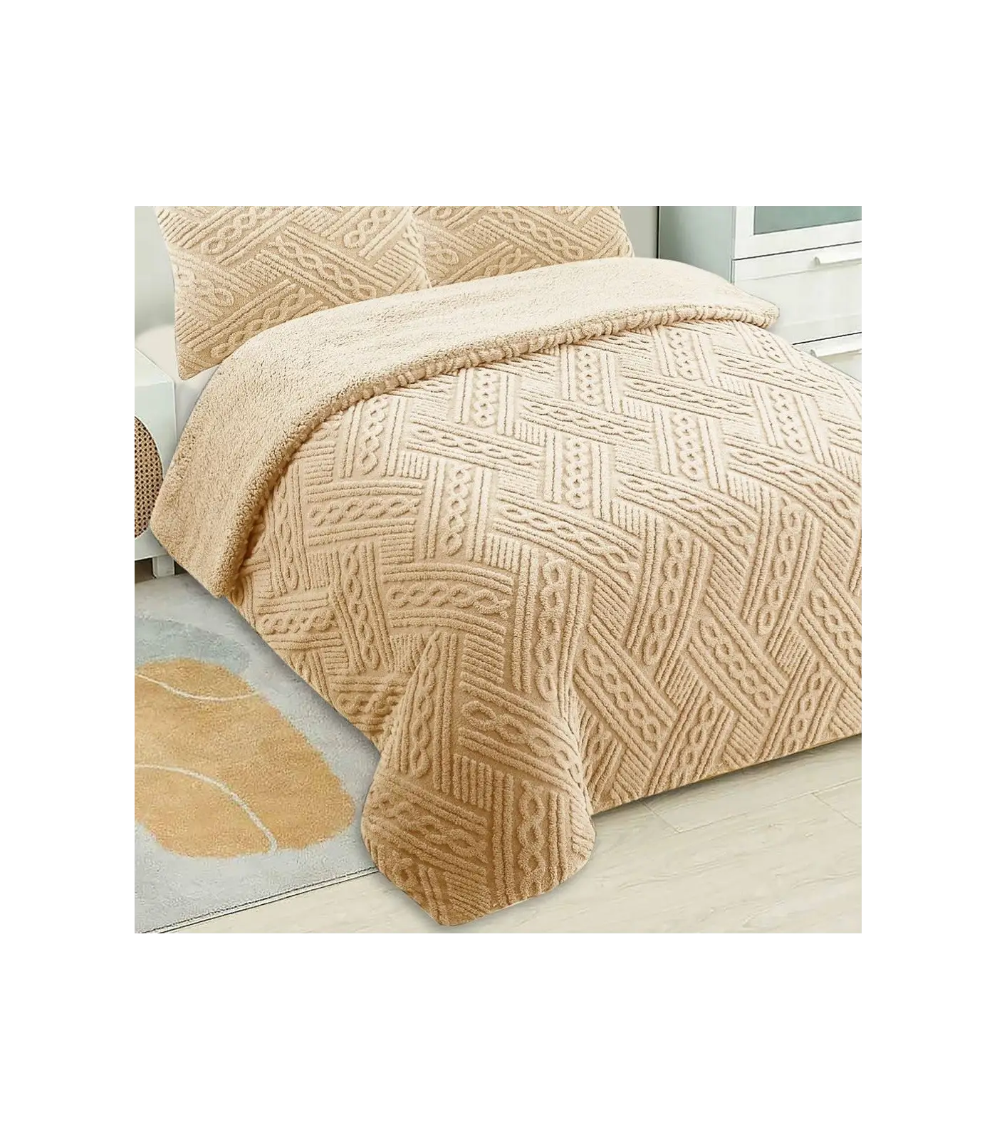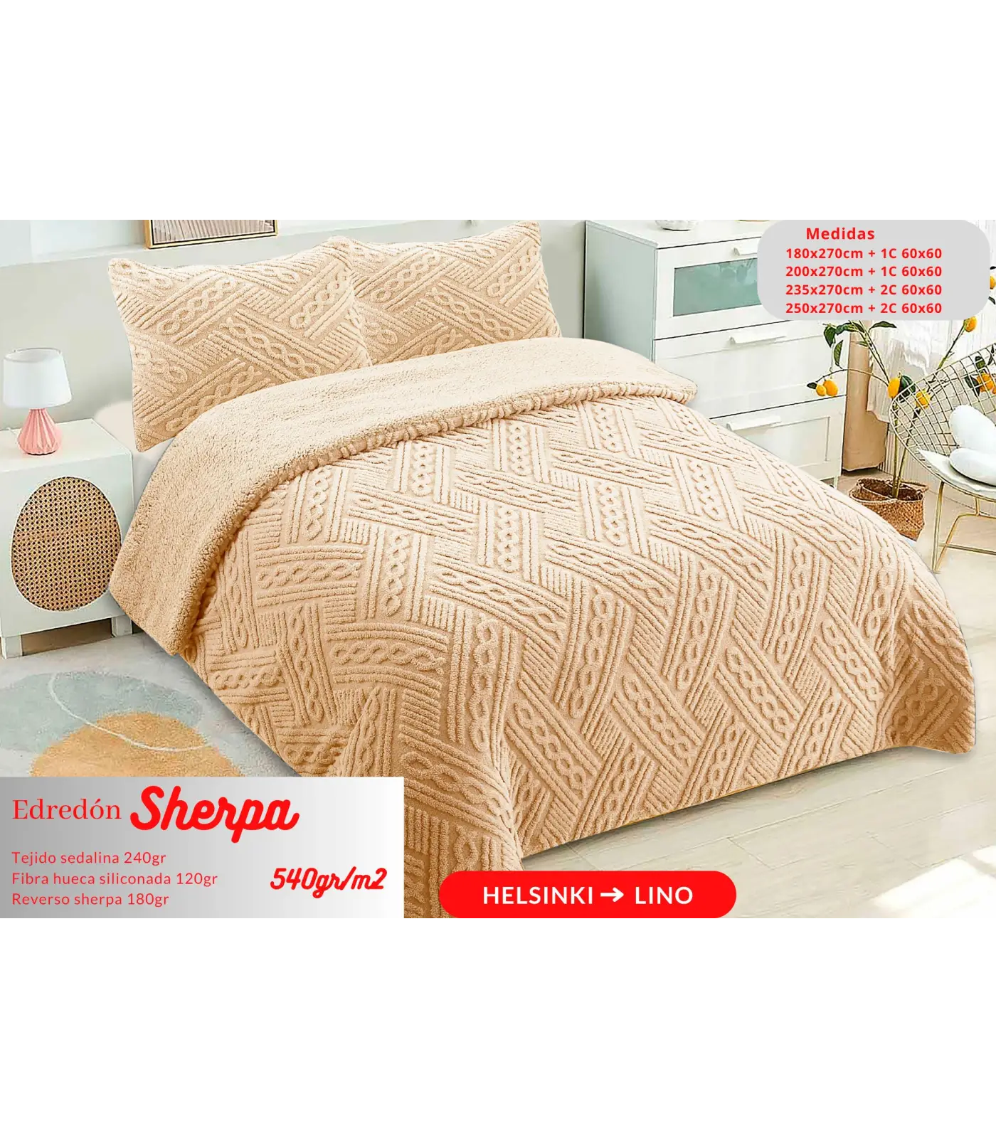 - Cama 150 cm (250×270cm). Incluye 2 fundas de cojín de 60x60 cm.