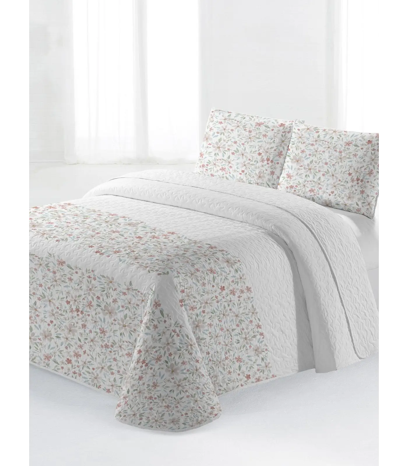 Colcha bouti de acolchado fino y pespuntes cosidos. Soft Touch. Tacto extra suave. Peso 340 g/m2 (frontal 80 g + reverso 80 g + relleno 180 g). Su acolchado tipo burbuja ayuda a que el acolchado se mantenga uniforme. Perfecta para los meses de primavera-verano. 100% poliéster.